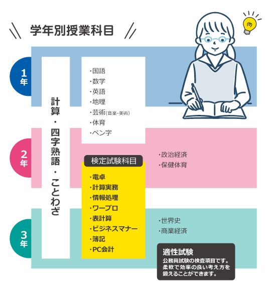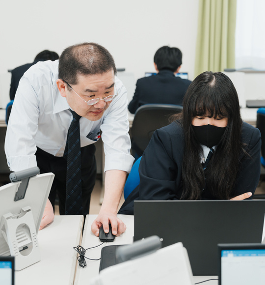 ❸ | 社会で働く時に必要なワープロ・パソコン・ビジネスマナー等の知識とスキルを習得させ検定試験に合格させることで、達成感と自信を身につけさせることに努力しております。 | |