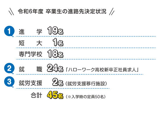 そのような生徒が安心して勉強できることと、卒業後の就職先・進学先に定着することができるような学校づくりに努力しております。