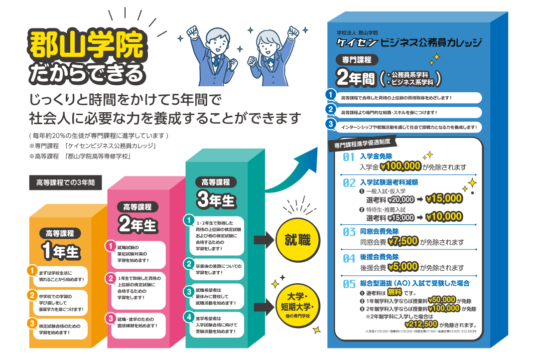● ケイセンビジネス公務員カレッジ ● 福島県立テクノアカデミー郡山 ● 福島県立テクノアカデミー浜 ● 福島県立テクノアカデミー会津 ● 郡山ヘアメイクカレッジ ● 日本調理技術専門学校 ● 郡山健康科学専門学校 ● 福島県理工専門学校 ● 国際ビジネス公務員大学校 ● 国際ビューティ&フード大学校 ● 国際アート&デザイン大学校 ● 国際医療看護福祉大学校 ● 国際情報工科自動車大学校 ● 東北電子専門学校 ● 仙台総合ペット専門学校 ● 郡山看護専門学校 ● 大原簿記専門学校 ● 東北保健医療専門学校 ● 東京会計専門学校 ● 日本工学院八王子専門学校 ● 東京福祉専門学校