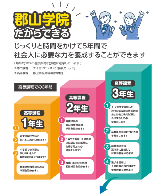 高等専修学校で3年間学び、卒業に必要な授業時間や指定学科の修了などの要件を満たせば、大学入学資格を得ることができます。郡山学院は、文部科学大臣から大学入学資格(高等学校卒業程度と同等)を付与されていますので、希望する生徒は大学や短大に進学しています。