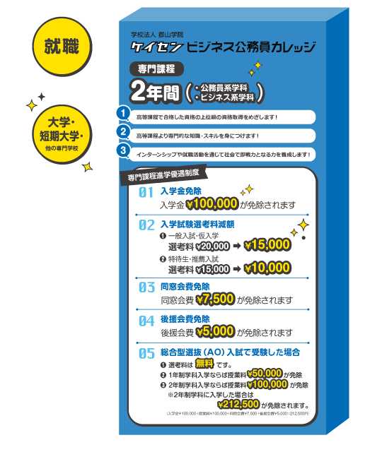 卒業生の半数が進学し半数が就職します。進学先は、大学、専門学校や看護学校、県立のテクノアカデミーなどです。大学進学は、推薦入試かAO入試で進学しています。(文科省から大学入学資格を付与されています。旧大検高等学校卒業程度認定試験を受験する必要はありません。)姉妹校の「ケイセンビジネス公務員カレッジ」に進学して、市役所職員や学校事務、税務署職員などの公務員になった卒業生もいます。